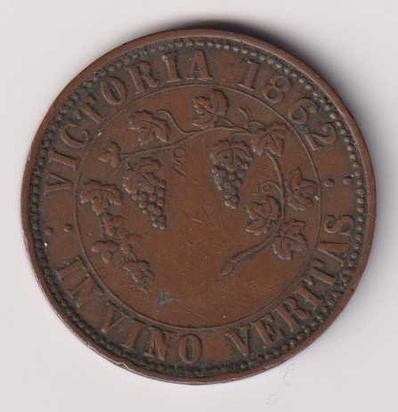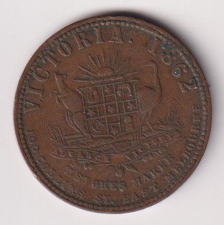 Australia, Victoria, Richmond, Myles Barrowclough (bookseller and stationer), Copper Penny Trade / Advertising Token, dated 1862, minted by Thomas Stokes of Melbourne, obverse: 100 BRIDGE ROAD in three lines at centre, BARROWCLOUGH curved above within line border, BOOKSELLER & STATIONER RICHMOND around, all within beaded border, reverse: coat of arms consisting of central shield (with ship, sheep / fleece, anchor and wheatsheaf in the quarters) on grassy ground with rising and rayed sun above, kangeroo and emu to either side, ribbon below groundline with the motto ADVANCE AUSTRALIA on it, VICTORIA 1862 above all, T. STOKES MAKER 100 COLLINS ST EAST MELBOURNE in two lines below, all within beaded border, edge plain, diam. 34mm